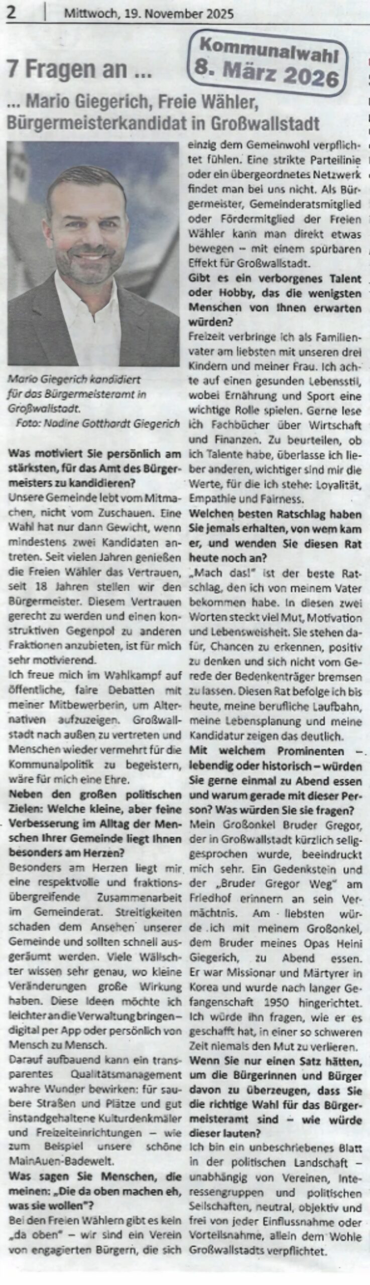 Grundsätzlich halte ich es für wichtig, dass die Bürgerinnen und Bürger eine echte Wahl haben. Eine Auswahl kann nur bestehen, wenn mindestens zwei Kandidaten antreten. Die Fraktion der Freien Wähler genießt seit vielen Jahren das Vertrauen der Wällschter Bürgerinnen und Bürger. Seit 18 Jahren stellen wir den Bürgermeister. Ich sehe es als unsere Pflicht an, diesem Vertrauen gerecht zu werden und einen konstruktiven Gegenpol zu anderen Fraktionen zu bilden. Ich freue mich auf öffentliche Debatten mit meiner Mitbewerberin, um Unterschiede herauszuarbeiten. Echte Alternativen anzubieten hat für mich viel mit Demokratie zu tun. Dass ich Großwallstadt als Bürgermeister in der Außenwahrnehmung vertreten darf, ist für mich als „Wällschter seit Generationen“ eine Ehre.