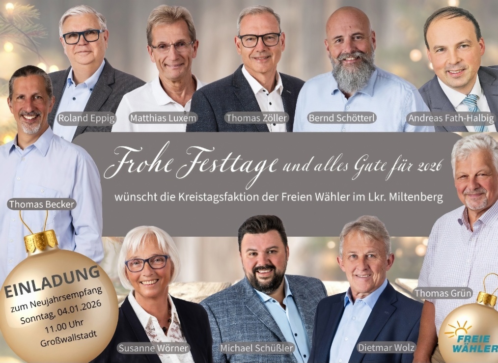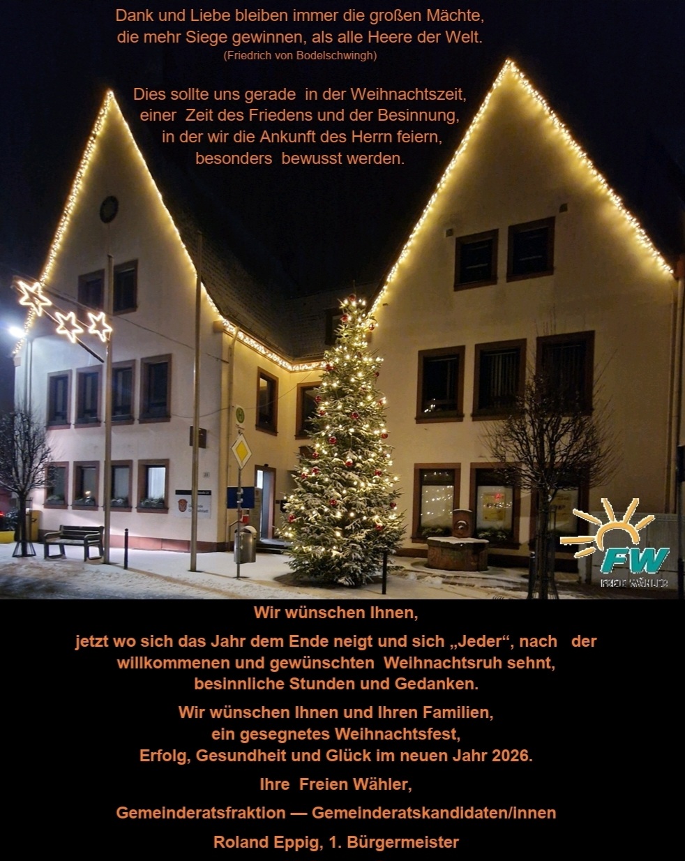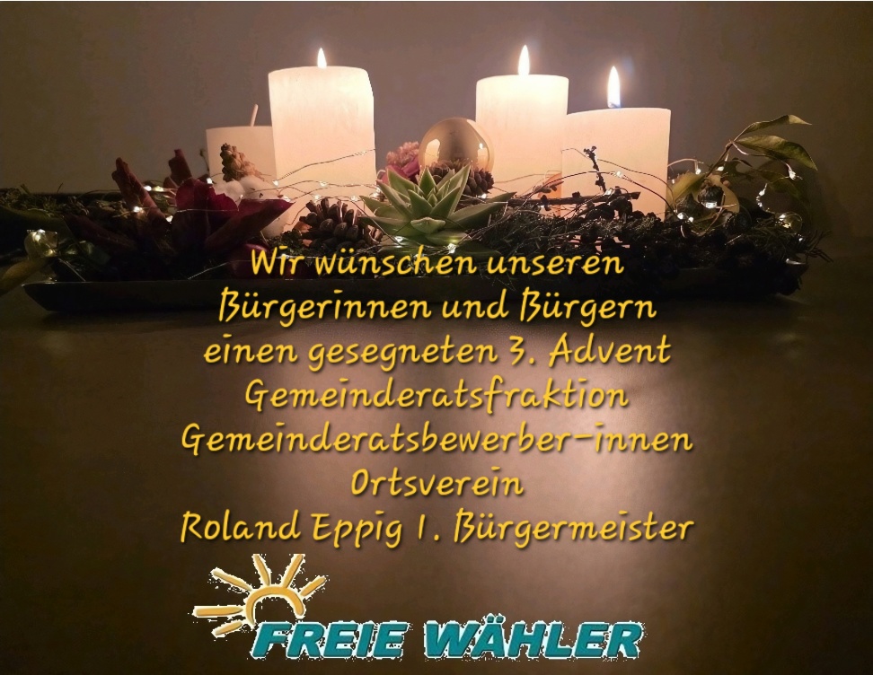 Wir wünschen allen Mitbürgerinnen und Mitbürgern, allen Kolleginnen und Kollegen im Gemeinderat, der Verwaltung und dir lieber Roland ein frohes und gesegnetes Weihnachtsfest im Kreise der Familie und ein gutes neues Jahr 2026, vor allem Zufriedenheit und Gesundheit. Ohne diese erscheinen doch vermeintlich große Probleme in einem ganz anderen Licht. Mitbürgern, denen es aus gesundheitlichen oder anderen Gründen nicht so gut geht, wünschen wir baldige Besserung.